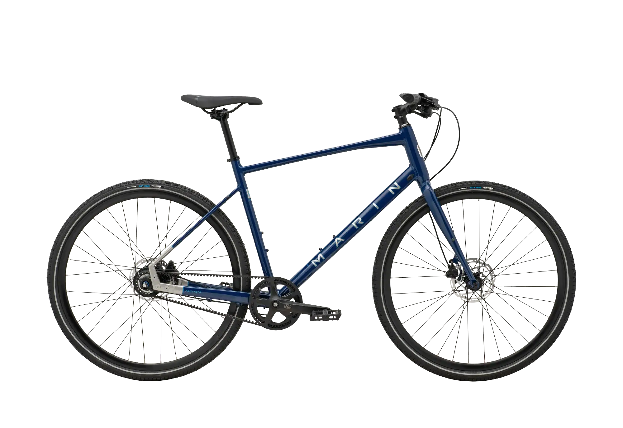 Vélo urbain Marin Presidio 3 à Paris, équipé d’une courroie Gates Carbon Drive, d’un moyeu Nexus 8 vitesses et de freins à disque hydrauliques. Vélo fiable, silencieux et sans entretien, idéal pour le vélotaf en Île-de-France.
